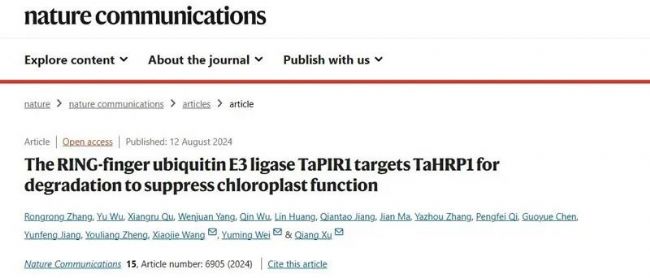 植物葉綠體在光合作用和免疫中起關(guān)鍵作用,但小麥中控制葉綠體相關(guān)核基因表達(dá)的精確及時(shí)的轉(zhuǎn)錄調(diào)節(jié)機(jī)制在很大程度上仍未知。泛素化是一種重要的翻譯后調(diào)節(jié)過程,E3泛素連接酶在植物的激素反應(yīng)、發(fā)育和免疫等多種細(xì)胞過程中起作用,但泛素連接酶E3在小麥免疫中的作用及其底物識(shí)別模式尚不清楚。2024年8月12日,Nature Communications在線發(fā)表了四川農(nóng)業(yè)大學(xué)魏育明/許強(qiáng)教授團(tuán)隊(duì)聯(lián)合西北農(nóng)林科技大學(xué)王曉杰教授團(tuán)隊(duì)題為The RING-finger ubiquitin E3 ligase TaPIR1 targets TaHRP1 for degradation to suppress chloroplast function的研究論文。本研究揭示了小麥中RING型泛素E3連接酶TaPIR1通過泛素化并降解轉(zhuǎn)錄因子TaHRP1來抑制葉綠體功能,從而增加植物對(duì)條銹病(Pst)的敏感性。