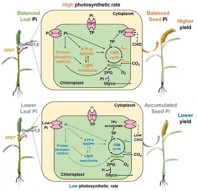 這些發(fā)現(xiàn)表明,光合作用的磷限制可以通過遺傳途徑解除或減緩,OsPHO1;2基因可以用于加強(qiáng)作物的育種策略,以獲得更高的磷利用效率及光合驅(qū)動(dòng)力。因此,本研究不僅揭示了葉片磷分配、光合作用與糧食產(chǎn)量之間關(guān)聯(lián)的新機(jī)制,而且為在有限磷投入的情況下提高作物產(chǎn)量提供了新路徑。