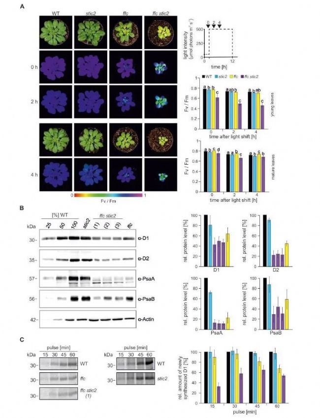 圖注:STIC2和cpSRP54的共同缺失導(dǎo)致擬南芥高光敏感性和D1積累降低。