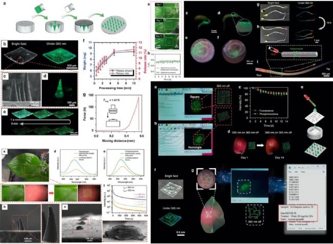 利用植物發(fā)光標(biāo)簽構(gòu)建植物信息云平臺(tái)的示意圖在先前報(bào)道的工作中,將材料送入植物的常用方法包括葉面噴霧、根部吸收和樹干/葉柄注射。然而,這些方法在將微米級(jí)顆粒送入植物方面存在局限性。雖然樹干/葉柄注射方法可以通過機(jī)械損傷角質(zhì)層和表皮等屏障直接進(jìn)入維管系統(tǒng),但其侵入性使其只適合某些大型木本植物。近年來,微針貼片因其最小的侵入性、安全性和效率,在藥物輸送應(yīng)用中被使用,呈現(xiàn)出一種有前景的替代方案。在先前的報(bào)告中,近紅外發(fā)光顆粒通過微針貼片注入皮膚,以記錄疫苗接種的長期信息。從醫(yī)療領(lǐng)域的微針貼片中汲取靈感,研究人員采用它們將長余輝材料送入植物葉片,實(shí)現(xiàn)信息記錄和編碼。為了構(gòu)建植物中的信息記錄平臺(tái),首先將SAO與H3PO4封裝以增強(qiáng)耐水性,并在植物復(fù)雜的內(nèi)部環(huán)境中保持穩(wěn)定的發(fā)光。然后,將微針貼片的尖端裝載SAO@H3PO4,創(chuàng)建排列良好的發(fā)光陣列,為植物提供特定的編碼信息。這些信息的匯編旨在建立一個(gè)智能農(nóng)業(yè)平臺(tái),其中植物發(fā)光標(biāo)簽作為通往云平臺(tái)的門戶,用于存儲(chǔ)各種生理信息,并實(shí)現(xiàn)基于物聯(lián)網(wǎng)的精準(zhǔn)農(nóng)業(yè)系統(tǒng)。
