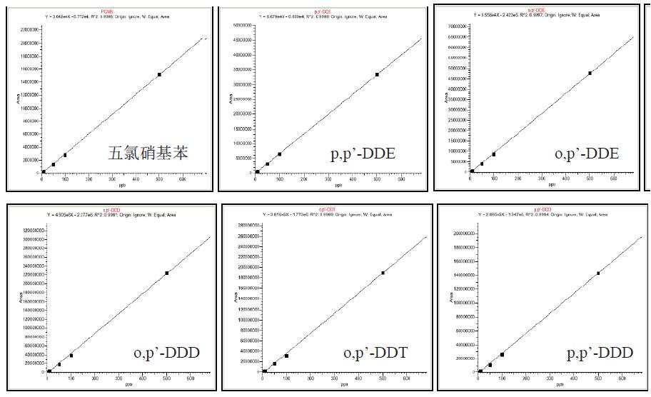 本實驗用TSQ Quantum XLS結合高惰性的弱極性色譜柱分析有機氯農藥和擬除蟲菊酯類農藥,得到了非常出色的結果。基質樣品的最低檢測限在0.05-0.5ppb之間,在1ppb-500ppb的范圍有良好的線性,且在基質加標樣品連續(xù)5針進樣的RSD%在1.52%-3.30%。