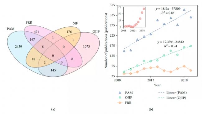 在該文章中,作者綜述并研究了四種最常用的葉綠素?zé)晒鉁y(cè)定分析平臺(tái)(分別是脈沖幅度調(diào)制熒光PAM、快速熒光動(dòng)力學(xué)OJIP、快速重復(fù)率熒光FRR、日光誘導(dǎo)熒光SIF),比較了它們所依賴的基礎(chǔ)理論和技術(shù)優(yōu)勢(shì),提出了關(guān)于解答“哪種方法最準(zhǔn)確和最有效”的許多論據(jù)。但迄今為止,每種方法的確切流行程度并未有數(shù)據(jù)評(píng)估。
