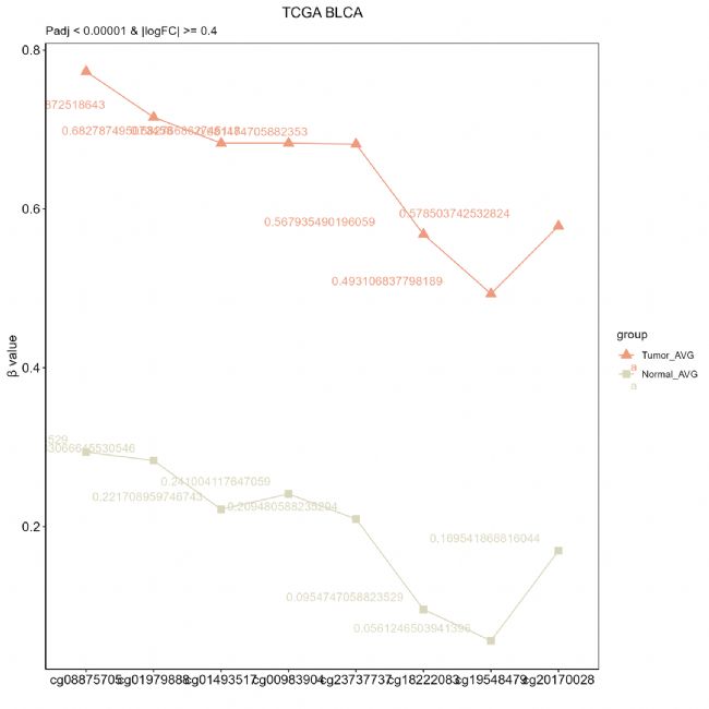 labs(x="",y="β value", title = "TCGA BLCA", subtitle = "Padj < 0.00001 & |logFC| >= 0.4") +