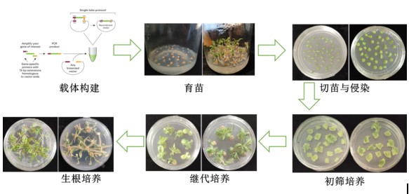 葆光生物采用農(nóng)桿菌介導的葉盤轉(zhuǎn)化法進行植物遺傳轉(zhuǎn)化,其主要過程包括:提取目的基因片段,導入質(zhì)粒構(gòu)建目...