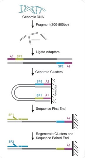 1.DNA樣本制備2.測(cè)序文庫(kù)構(gòu)建3.DNA成簇?cái)U(kuò)增4.高通量測(cè)序5.生物信息學(xué)分析
